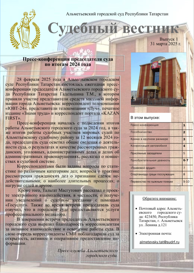 Опубликован первый выпуск 2025 года электронной газеты "Судебный вестник". ![]() Пресс-служба суда. |