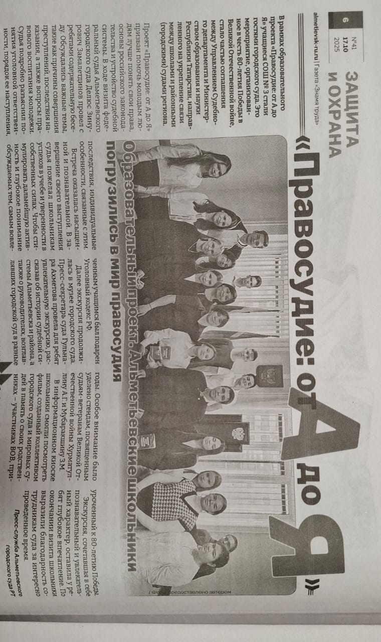 В газете «Знамя труда» № 41 (12509) от 17.10.2025 опубликована статья «Альметьевские школьники погрузились в мир правосудия». ![]() |