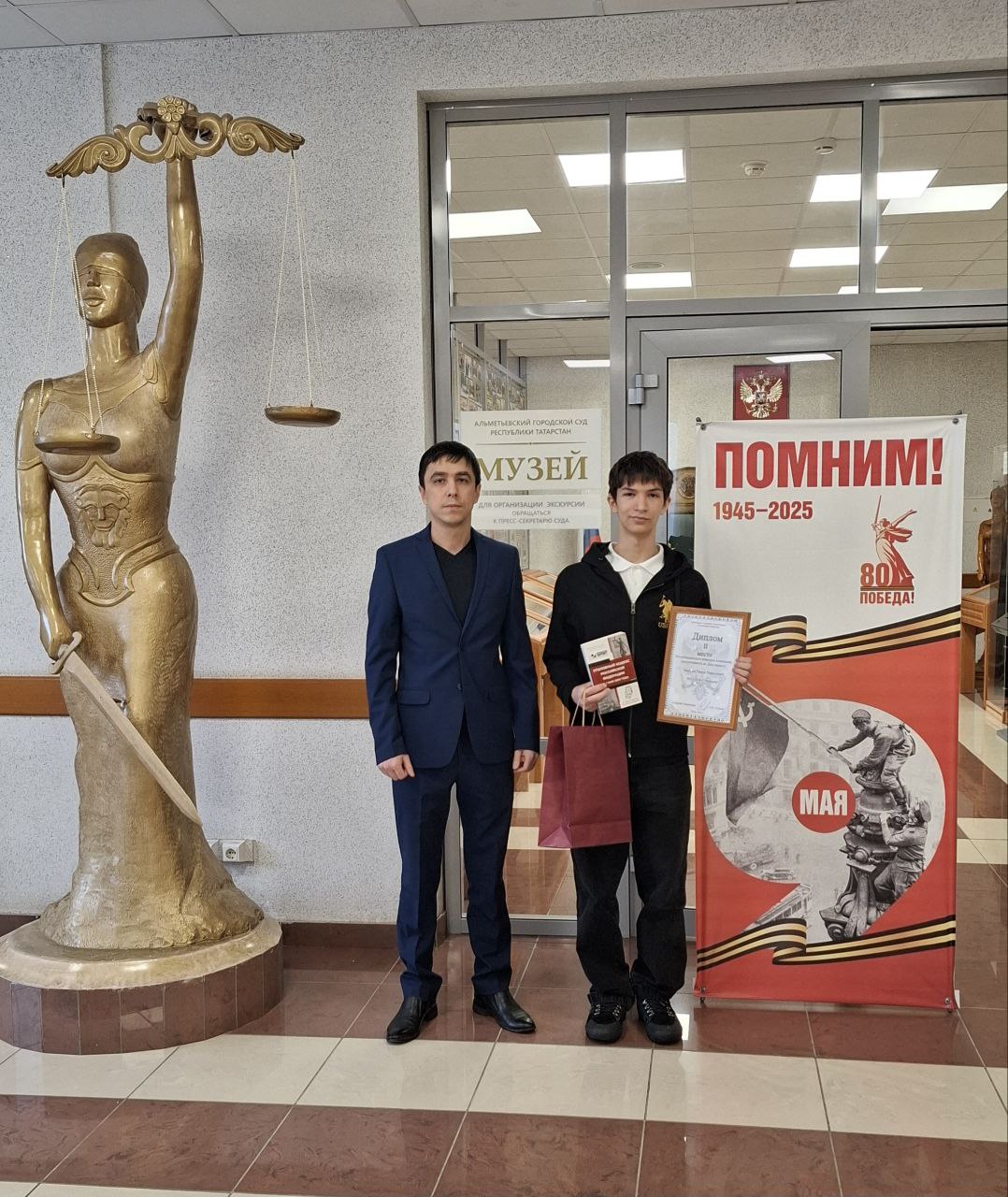 ![]() В Республике Татарстан завершился ежегодный конкурс сочинений, посвященный Дню юриста. Мероприятие, организованное в рамках проекта «Правосудие: от А до Я» Управлением Судебного департамента, собрало талантливых школьников 9-11 классов и студентов 1-2 курсов техникумов. Сегодня в Альметьевском городском суде прошла торжественная церемония награждения победителя. В этом году в конкурсе приняли участие множество дарований из города Альметьевска и Альметьевского района. По итогам напряженной борьбы второе место занял Закиров Тимур Рафаэлевич, ученик 11 класса средней школы №23 «Менеджер». Его успех стал возможен благодаря поддержке и наставничеству куратора Михайловой Ирины Николаевны. Заместитель председателя суда Замалетдинов Делюс Зинурович лично поздравил Тимура с заслуженной победой. Победителю был вручен диплом, памятный подарок и Уголовный кодекс Российской Федерации. Делюс Зинурович пожелал успехов в учебе и дальнейшего освоения безграничного мира права! Пресс-служба Альметьевского городского суда РТ. |