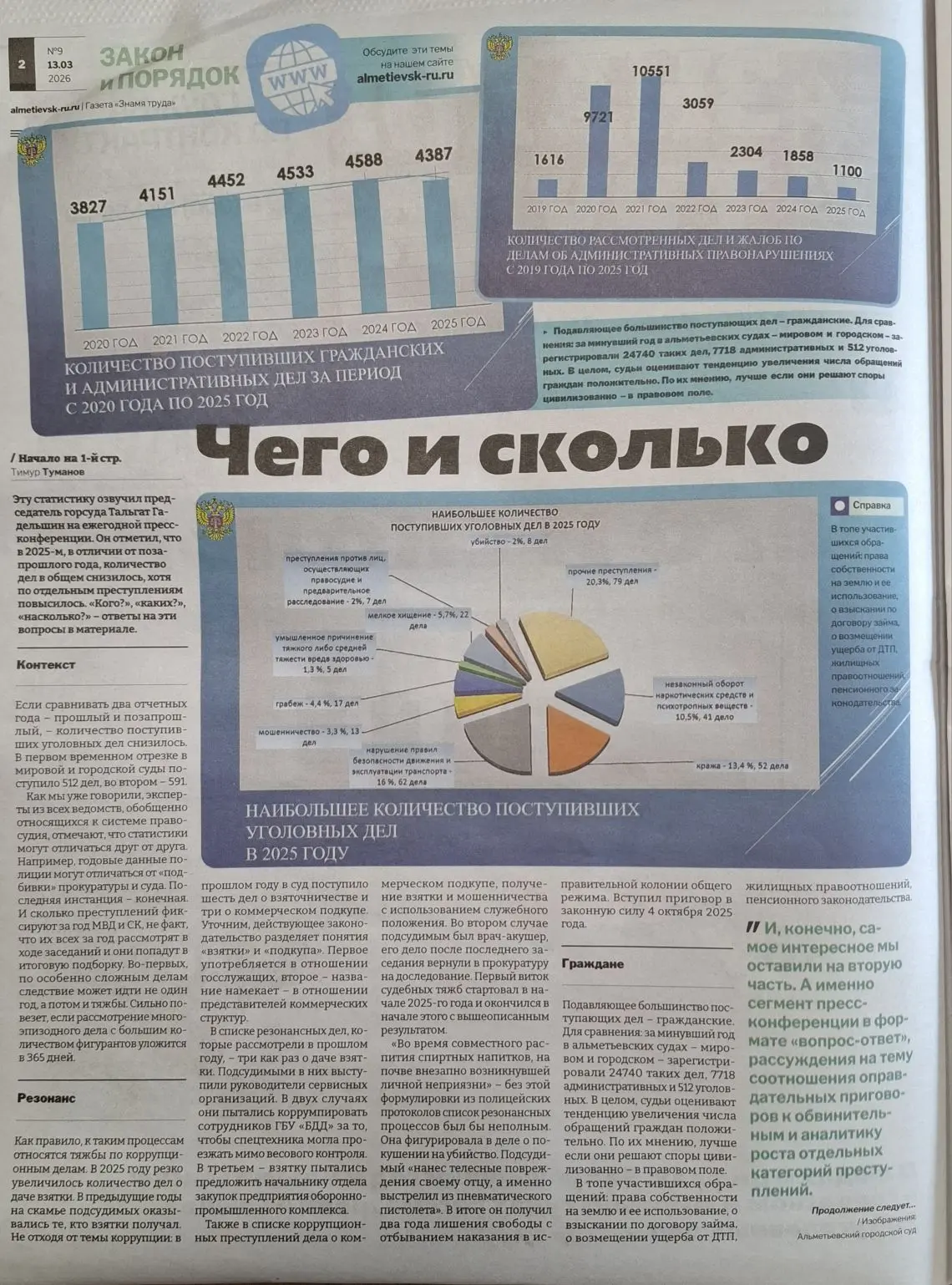 | В газете «Знамя труда» № 9 (12528) от 13.03.2026 опубликована статья об итогах работы Альметьевского городского суда за 2025 год. | версия для печати |