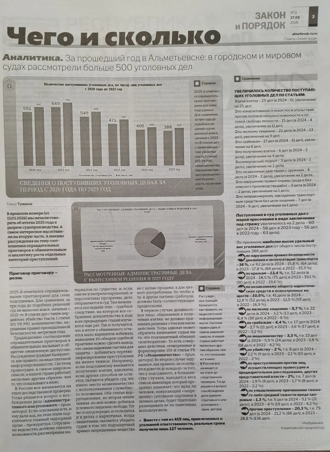 В газете «Знамя труда» № 11 (12530) от 27.03.2026 г., опубликовано продолжение информации об итогах работы Альметьевского городского суда за 2025 год. ![]() |